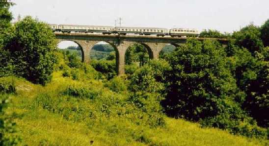 Viadukt: Ein mächtiges Bruchstein Brückenbauwerk das seit 1853 unbeschadet dem Eisenbahnverkehr dient.
